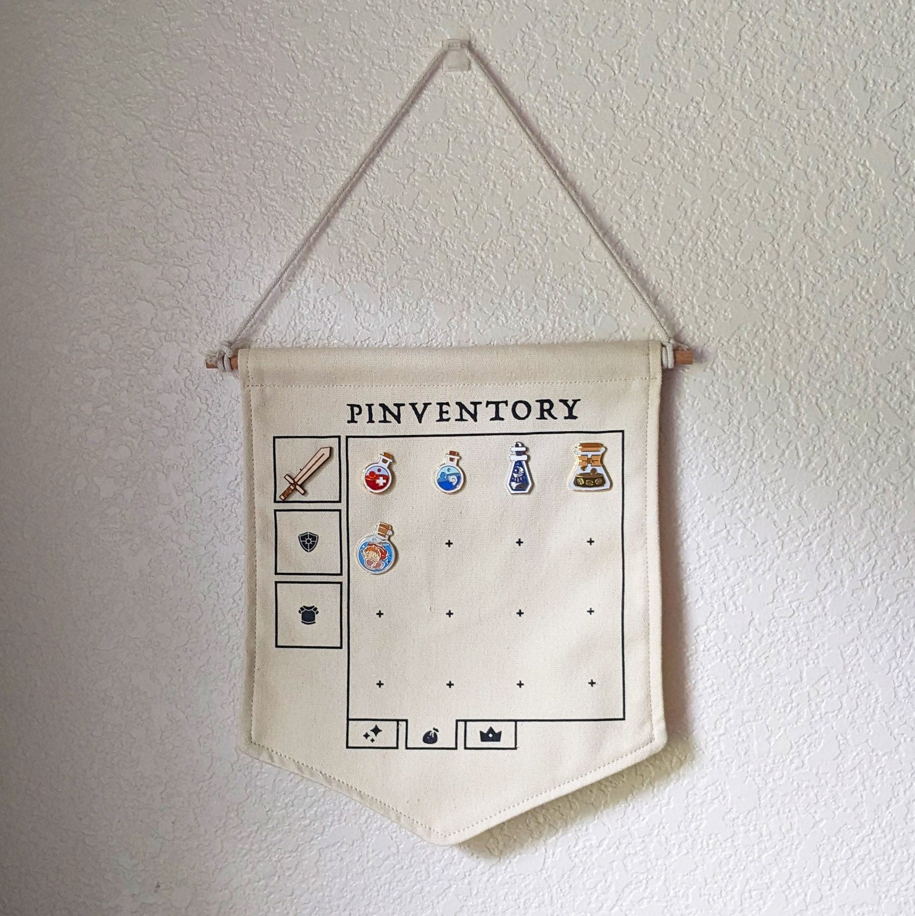 It's an empty inventory pin banner ready to be filled with items for your daily adventures and store other items you may pick up along the way! The canvas banner is made of a cotton canvas that has been strung onto a wooden dowel and can be hung on the wall by the string attached to each end of the wooden dowel. The flag is a great for displaying pins in your bedroom, dorm, gameroom, and more. It can roll up easily to transport or send as a gift!